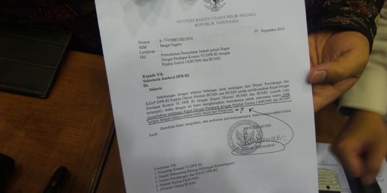 "Dengan ini kami mengharapkan bantuannya untuk sementara waktu tidak menerbitkan undangan Rapat Dengar Pendapat dengan Pejabat Eselon I KBUMN dan BUMN sampai dengan adanya arahan lebih lanjut dari pimpinan," demikian isi salinan surat tersebut.